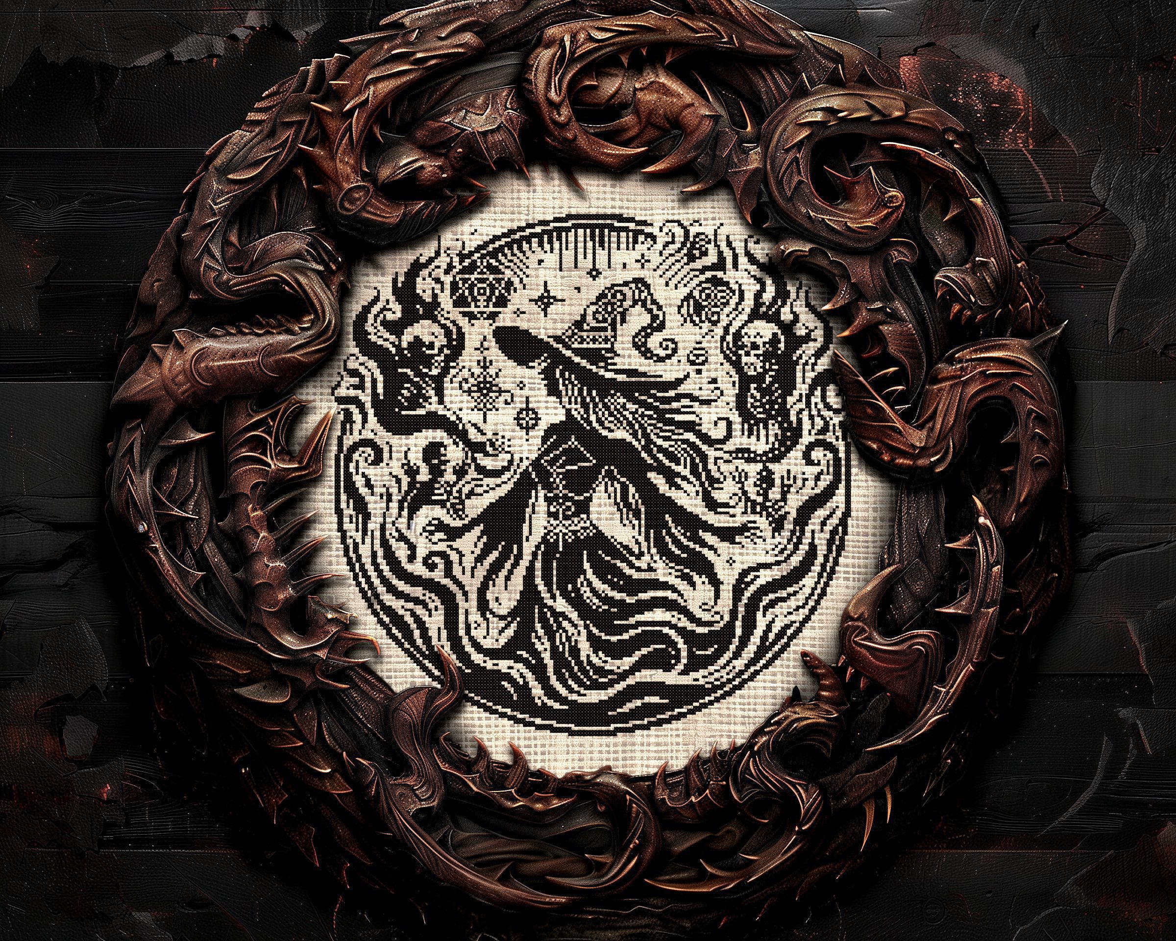 Each stitch in this design is a verse in a dark poem, each thread a whisper of secrets untold. Imagine stitching this gothic cross stitch pattern, where the haunting beauty of the Wraith Witch is encased in an almost hypnotic array of twisting vines and eerie skulls, a true piece of creepy cross stitch artwork.