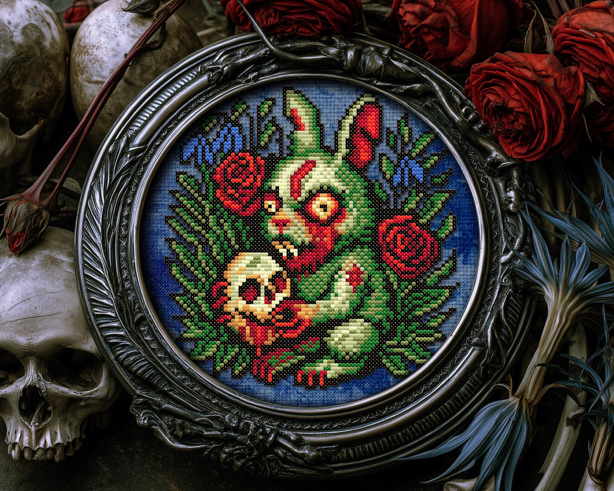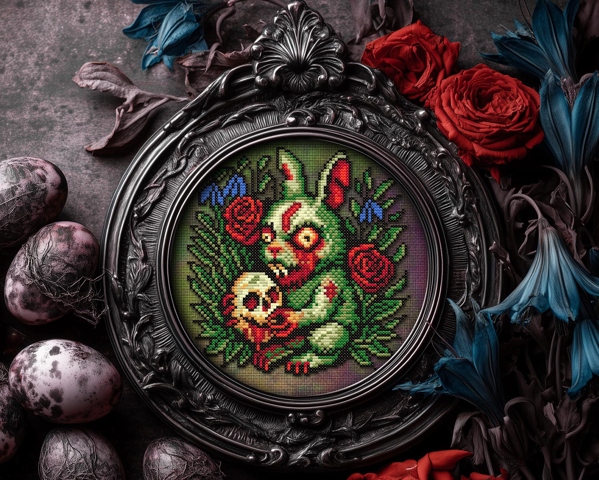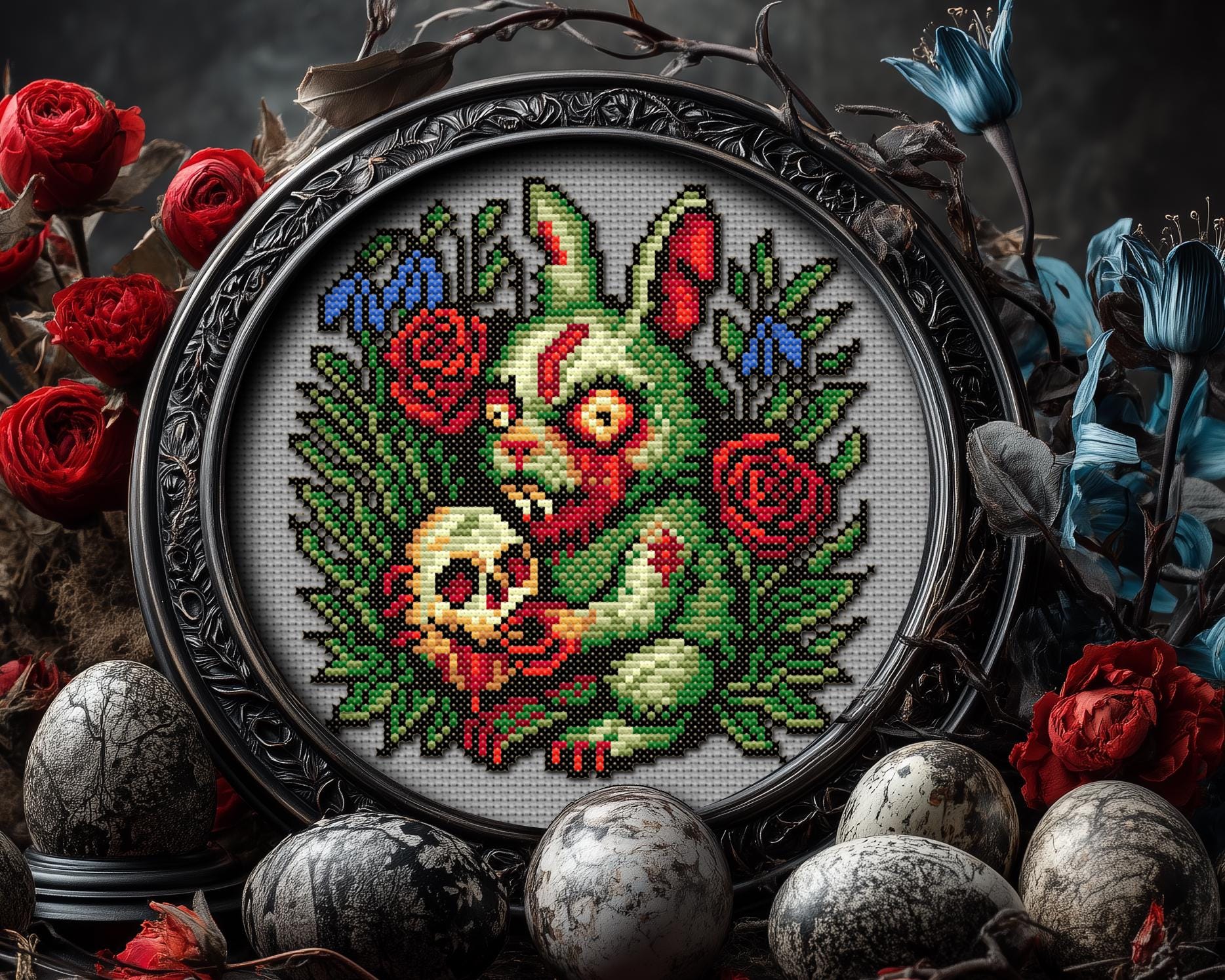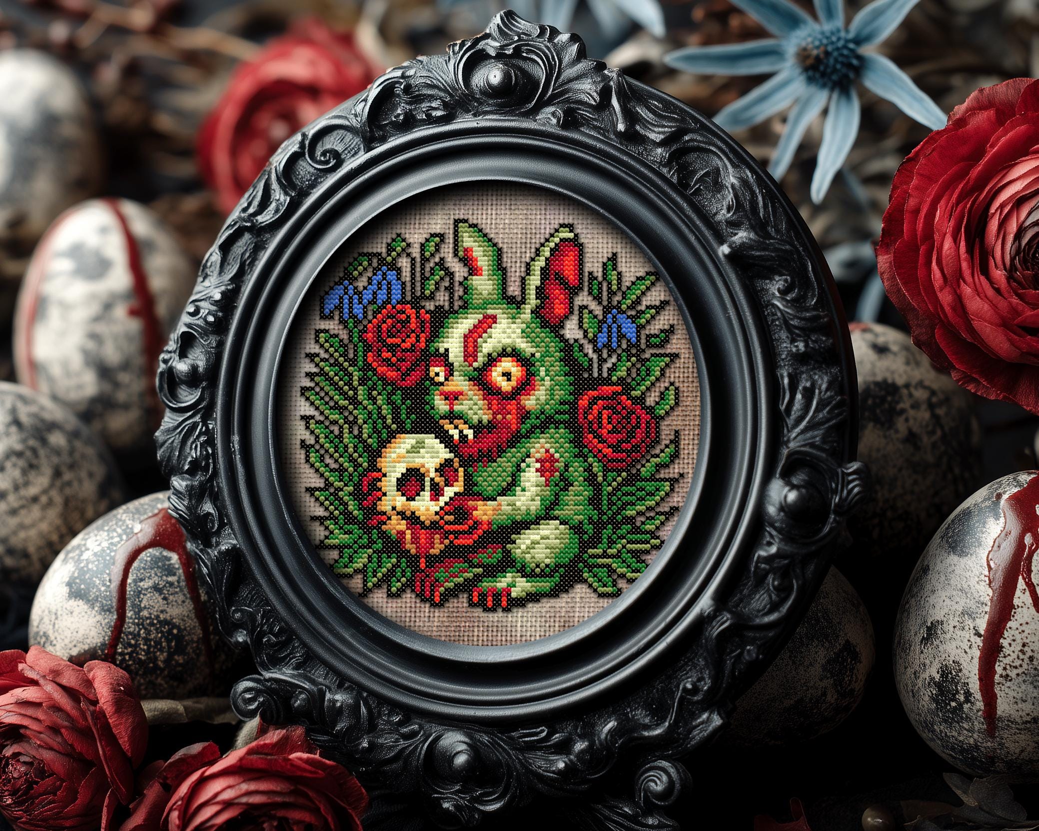 Oh, sweet haunted Ostara, you’re not ready for the unholy chaos this little beast is bringing to your hoop! Our Easter Zombie Bunny Cross Stitch Pattern is here to hijack your spring stitching with unhinged energy, gore-soaked giggles, and teeth that have definitely chewed more than carrots. This isn’t your grandma’s pastel bunny, it’s the deranged lovechild of a zombie bunny and a creepy cross stitch coven ritual gone sideways. Surrounded by gothic roses and belladonna blooms, this undead fluffball is elbows-deep in a rotten egg hunt of doom, gripping a skull like it’s the last Cadbury creme egg on Earth. Perfect for chaotic stitchers craving a bite-sized dose of gothic cross stitch, Halloween cross stitch, modern cross stitch, and yes, even a deliciously deranged easter cross stitch or Ostara cross stitch. Because nothing says Happy Zombie Jesus Day like a blood-splattered bunny mid-frenzy, right?
