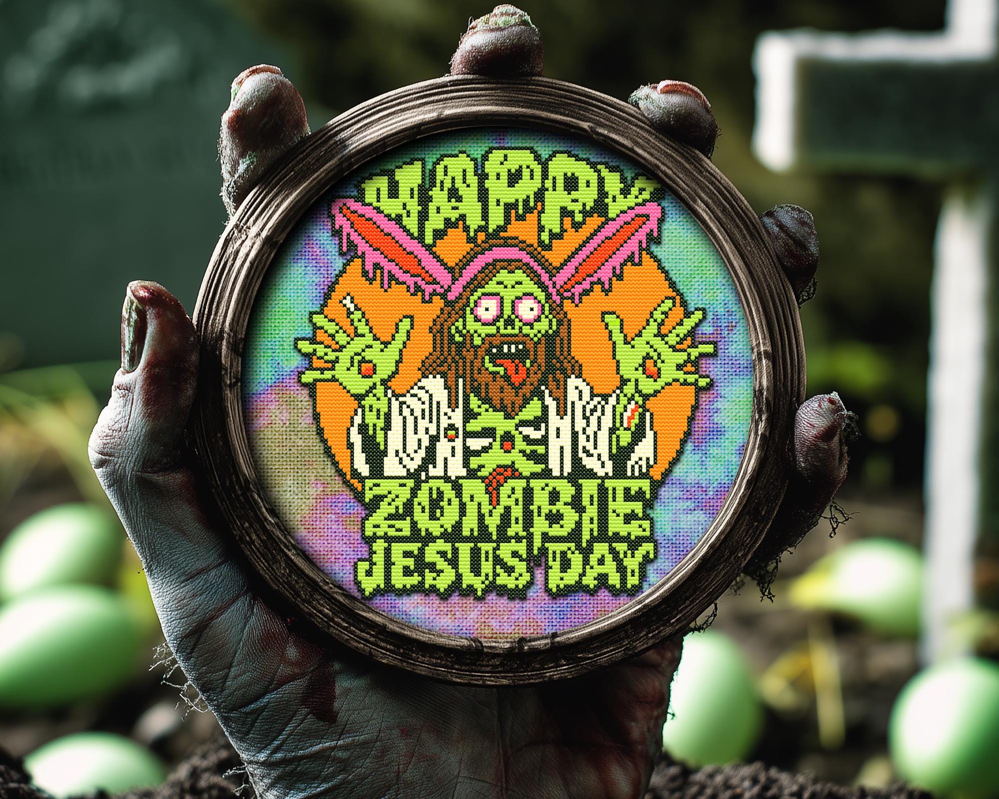 So let your needles rise like the dead, fellow stitchers, and celebrate Zombie Jesus in the most extra way possible. Because nothing says “He is risen” like pink bunny ears, undead fingers, and a face only a mother (or necromancer) could love. Grab this xstitch pattern and give your hoop a resurrection worth screaming about.