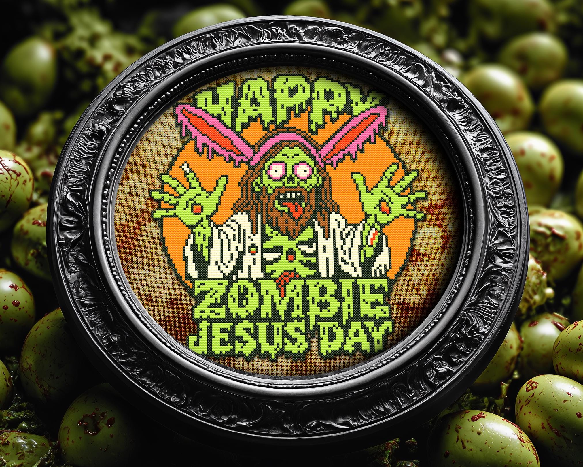 Oh, honey, buckle up your bunny ears and grab your holy water ’cause this unholy resurrection of chaos is hopping straight into your hoop! This Zombie Jesus Cross Stitch Pattern is your blasphemous bestie for all things Easter-but-make-it-apocalyptic. Whether you’re a proud stitch witch, a heathen with a hoop, or just here for the sacrilegious snark, this zombie cross stitch delight is everything your twisted little heart desires. It’s loud, it’s lurid, it’s wearing pink floppy ears and a rotted crown of thorns and it’s dying to be stitched.